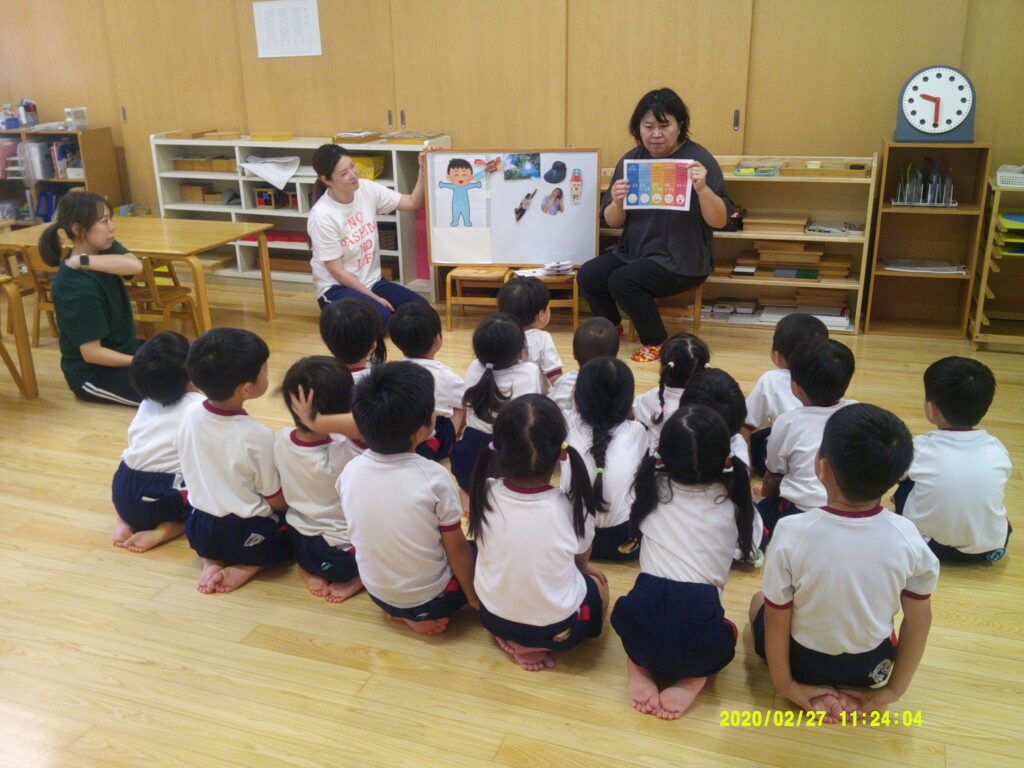 話の中で「外に行く時に何を準備したらいいか」を尋ねられると、「お茶を飲んでから行く!」「帽子を被る!」と、普段行っている習慣はすぐに出てきた子ども達。加えて、「日焼け止めを塗る!」と家庭でしているのであろう対策を教えてくれる子もおり、子どもなりの意識も知ることができた時間になりました。