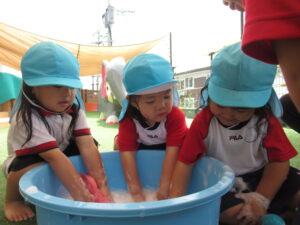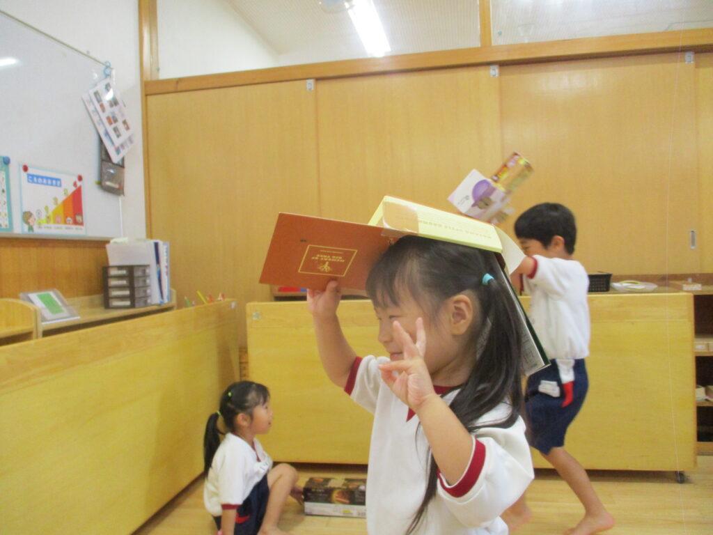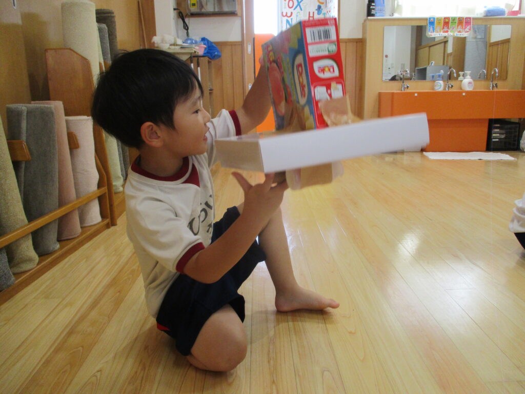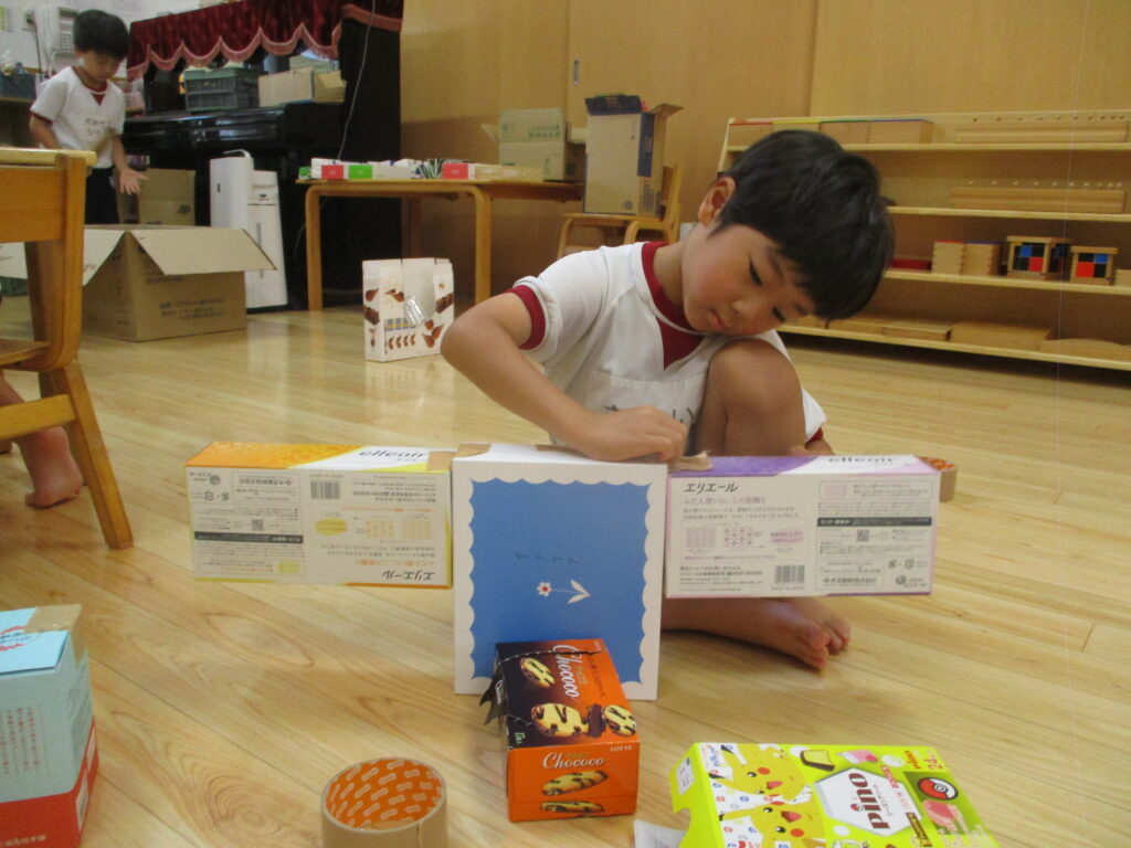 家庭にも協力していただいて、色んなお菓子の箱やトレーなどを持ってきてもらったものを使い、一人ひとり自分で考えながら作っていきました。ロボットを作ろうと色んなサイズの箱をあちこちに取り付けたり、バスを作りながら途中で飛行機にチェンジしてかっこよく作り上げたり、それぞれの想像力がしっかりと働いて、素敵な作品が沢山できました!