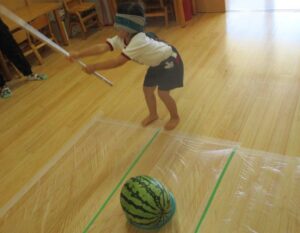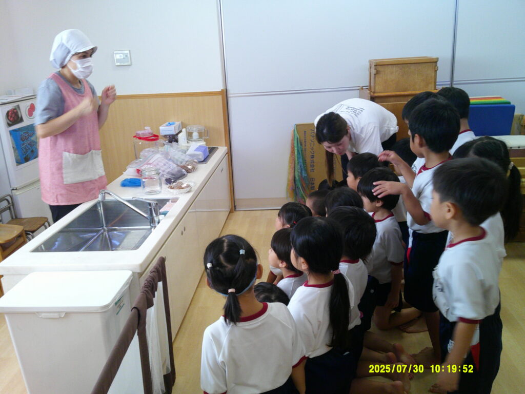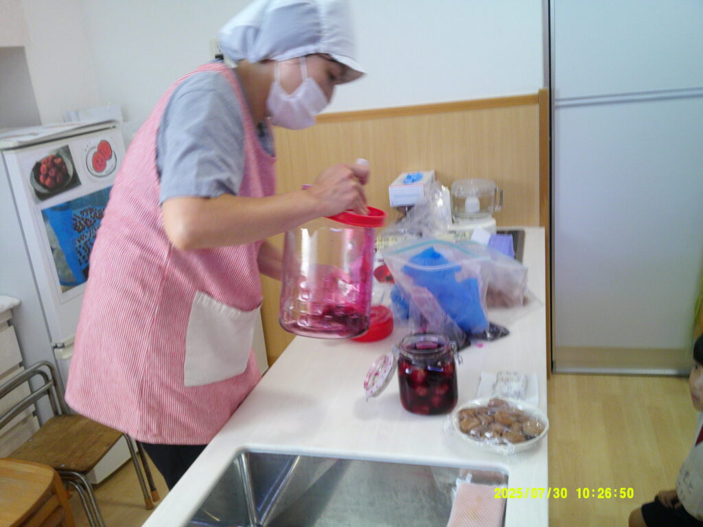 容器に梅と紫蘇を交互に入れて最後に梅酢を入れていきながら、「梅はどんな色になると思う?」と尋ねると、殆どの子が「赤!」と答えたり、梅酢の色を見ながら「綺麗!」「わー!」と声に出したり、沢山反応する姿が見られました。美味しい梅干しになりますように♪