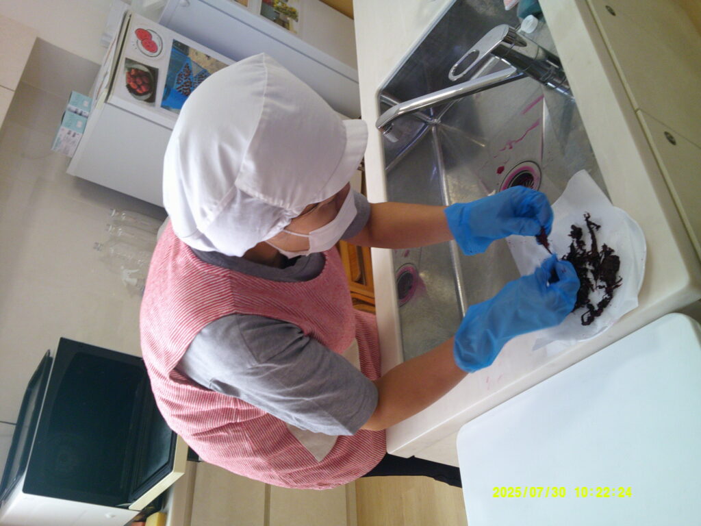 実際にレンジに入れて温めると乾燥した紫蘇ができ、パリパリになった様子を見たり、匂いをかいでみたり、紫蘇の良い香りの中で「食べたい!」気持ちになった子どもたちでした。