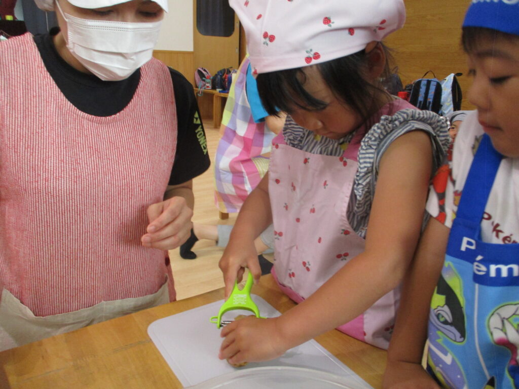 具材の人参・じゃが芋を洗って皮をむいて切って、お米を研いで・・・さすがの年長さんはスムーズに準備をしてくれました。