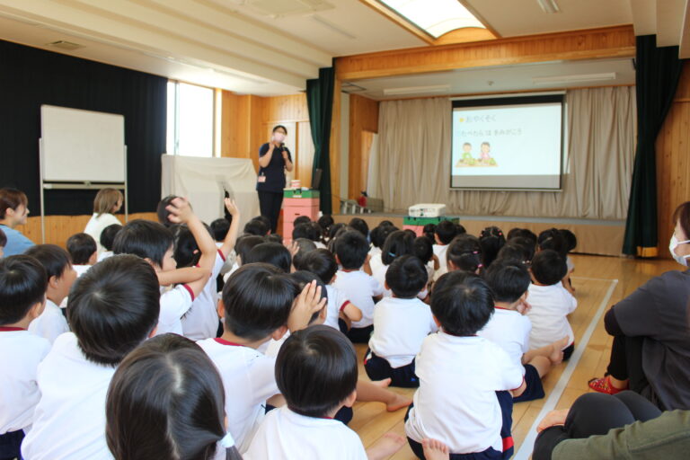 途中で「周りの人が嬉しくなる言葉分かる?」と尋ねられると、年長さんが「ありがとう!」とすぐに答えてくれる姿もあり、色んな『平和』について考えることができました。