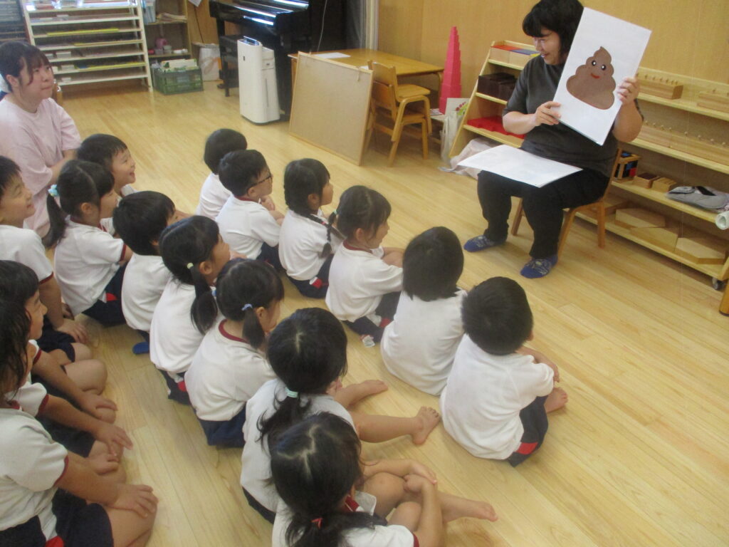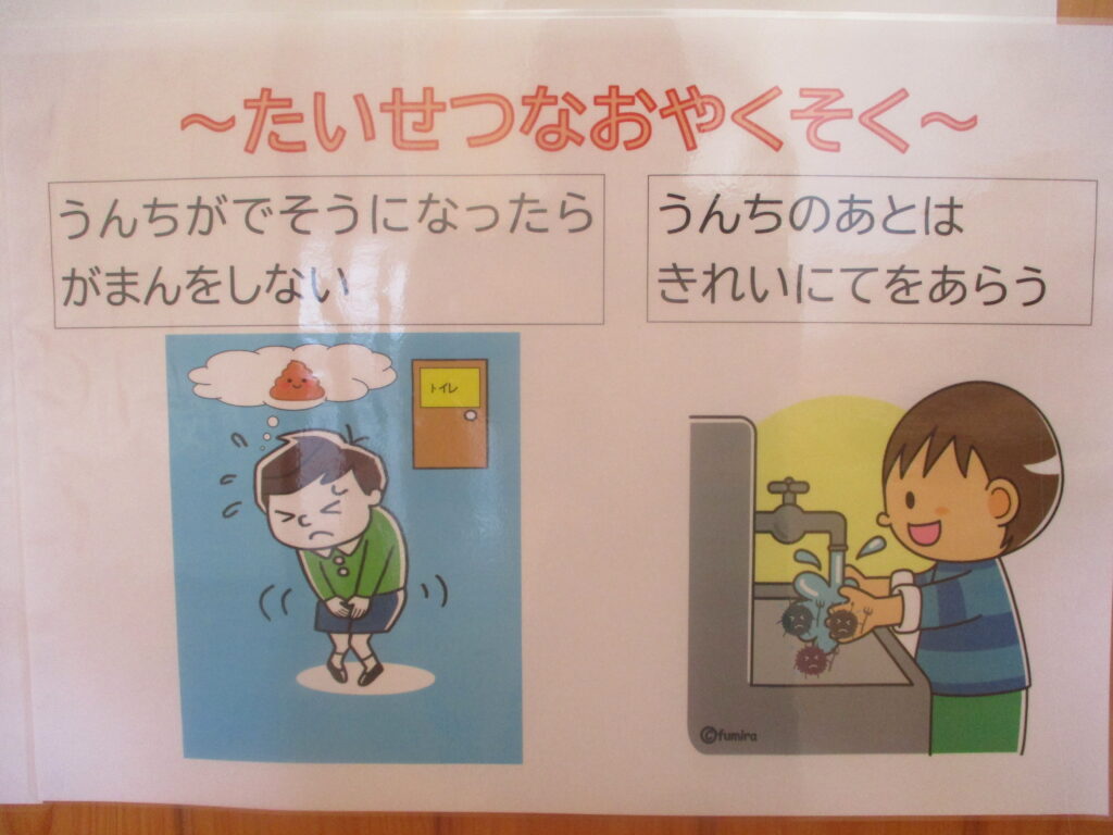 最後に「うんちが出そうになったら我慢をしない」「うんちの後はきれいに手を洗おう」と大切な約束も確認したので、『いいうんち』を出せる体になるよう、一人ひとりが意識できるといいなと思います。