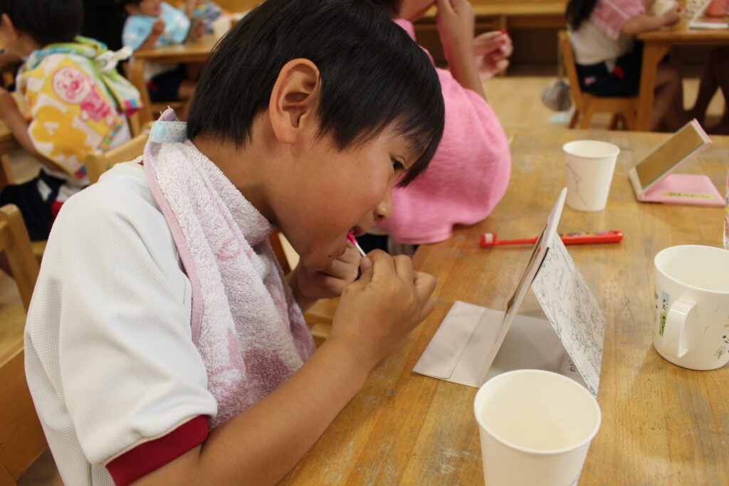 染め出し用の薬液を初めてつける子が殆どで「これをつけるの?」と少しどきどきしながらつけていきました。ピンク色の液がついた自分の歯を鏡で見ながら笑う姿もありましたが、実際にはぶらしでピンク色になった所を磨き始めると、色が取れるようにととても真剣に黙々と磨いていたので、終わる頃には綺麗な歯に仕上がっていました!