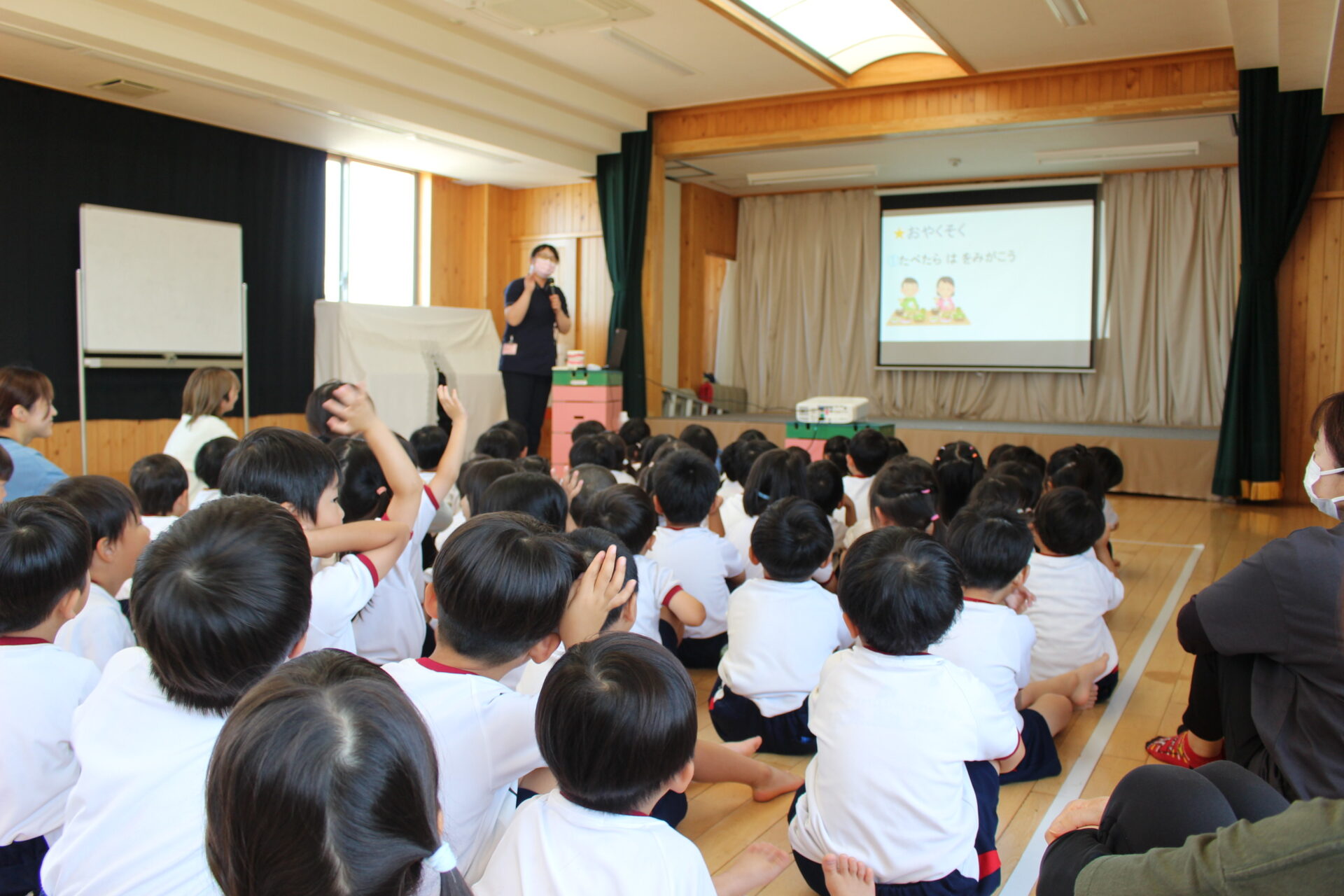 終わってから「どんなお話をしてもらった?」と尋ねると、「甘いのを食べる時は1こだけ!」「ばいきんがいっぱいになったらむし歯になる」「はぶらしを(口に)入れたまま走ったらだめ!」など、年少さんからも沢山答えが返ってきました。