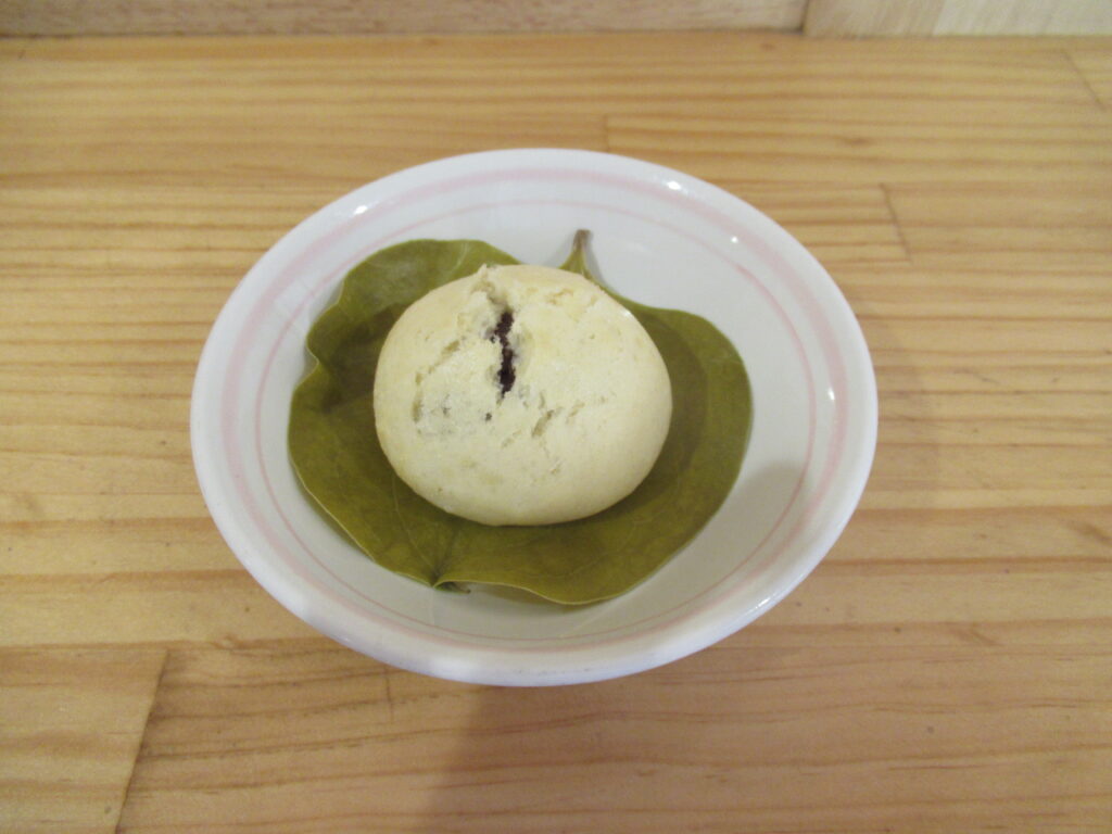 おやつは、サルトリイバラの葉っぱを下に敷いて蒸した「ばらっぱまんじゅう」でした。