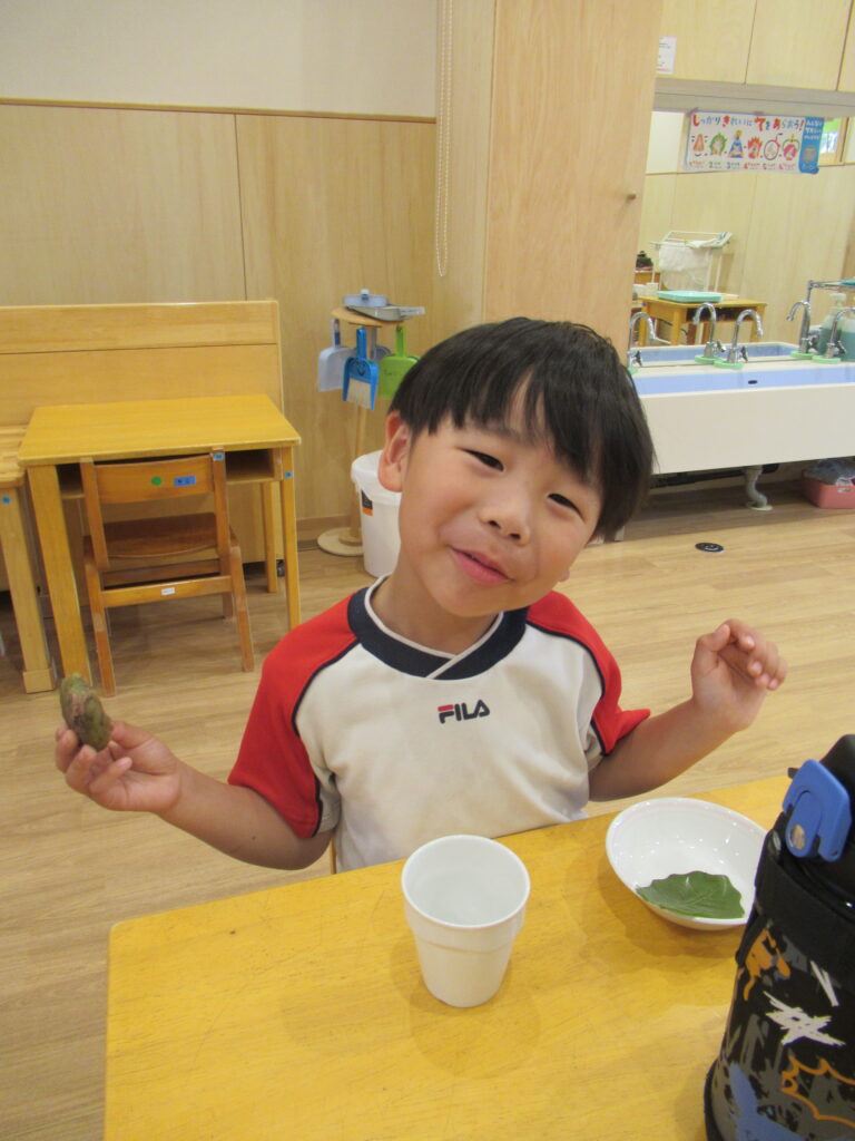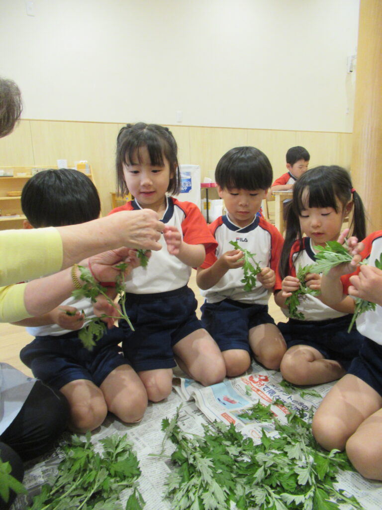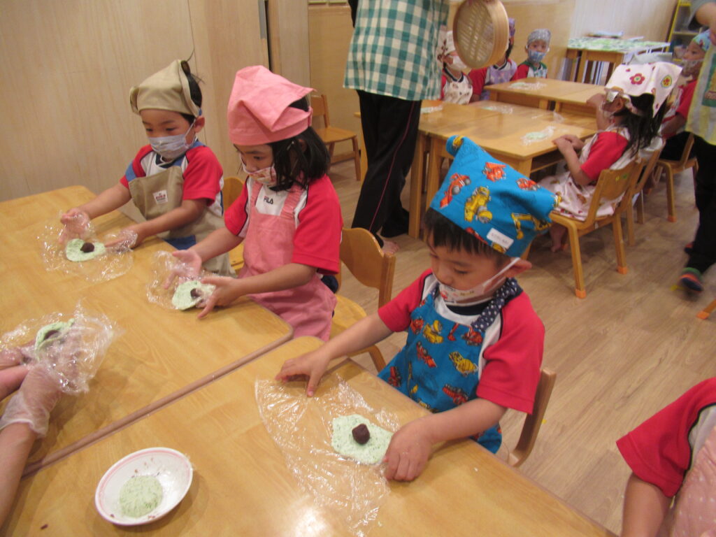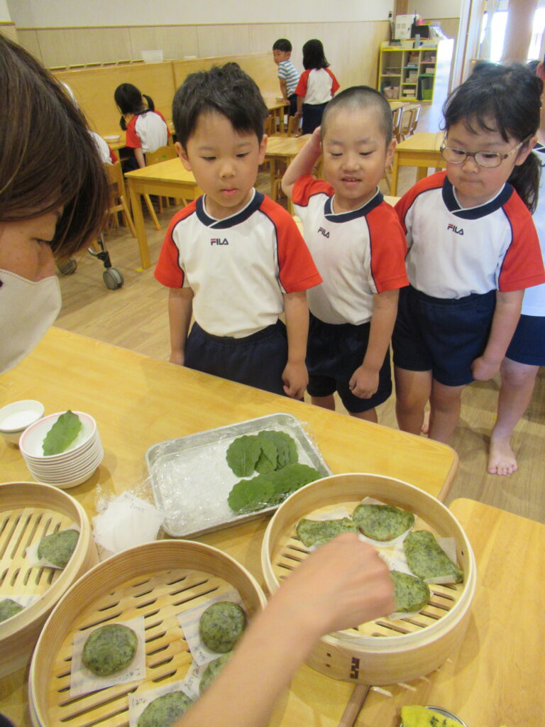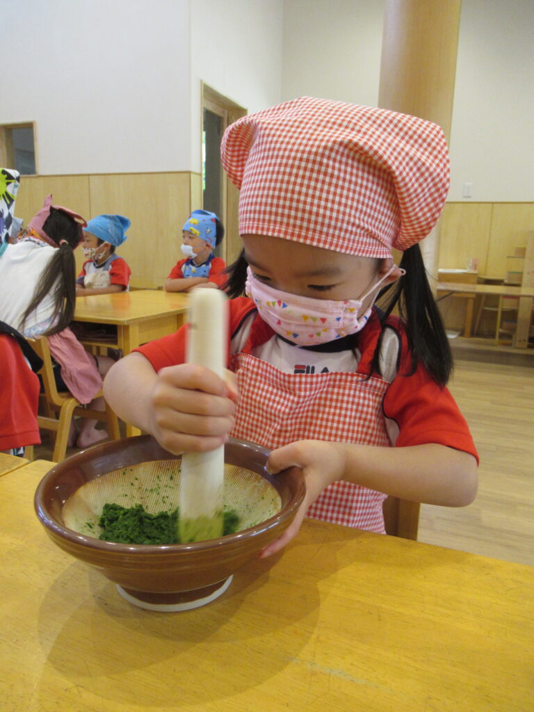 よもぎをすりつぶしたり、生地をこねたり、あんこを包んだりと1つ1つの作業を五感を使って楽しんでいました。