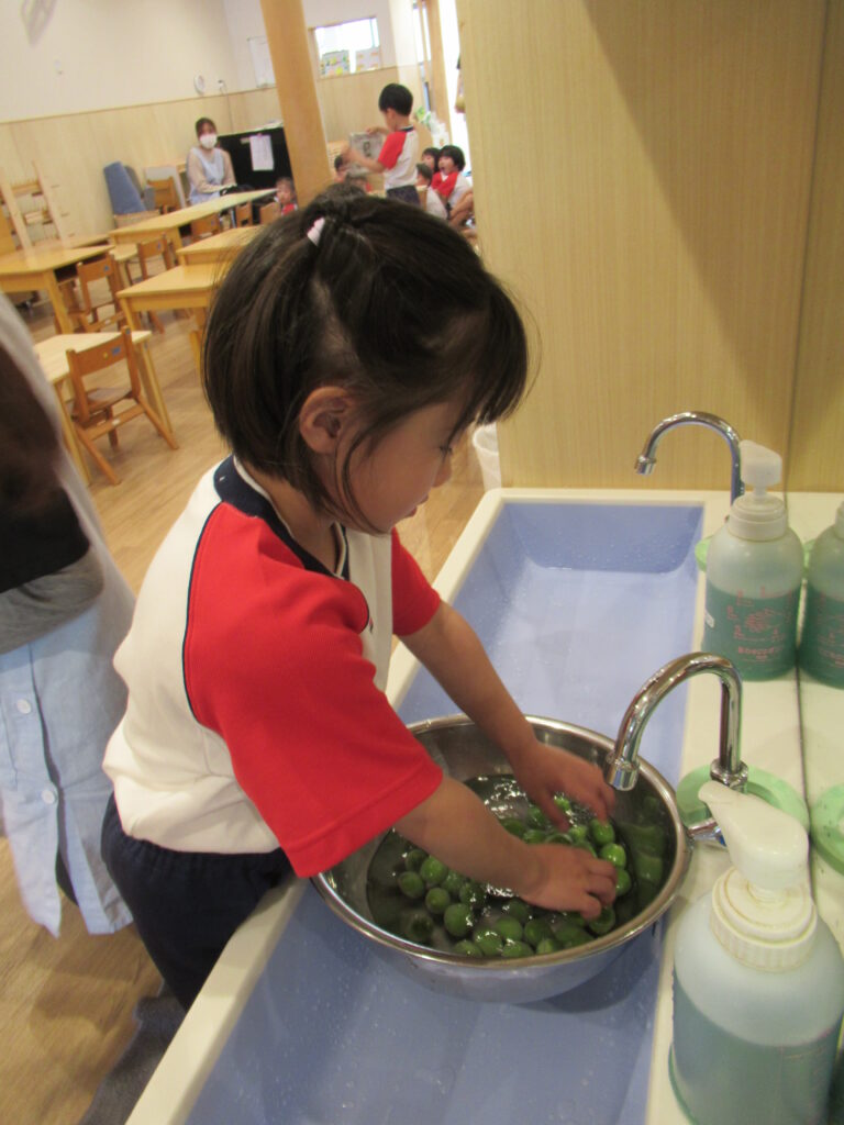 前日にみんなで梅のヘタ取りをして梅を洗いました。