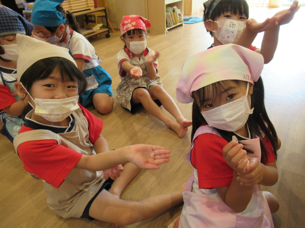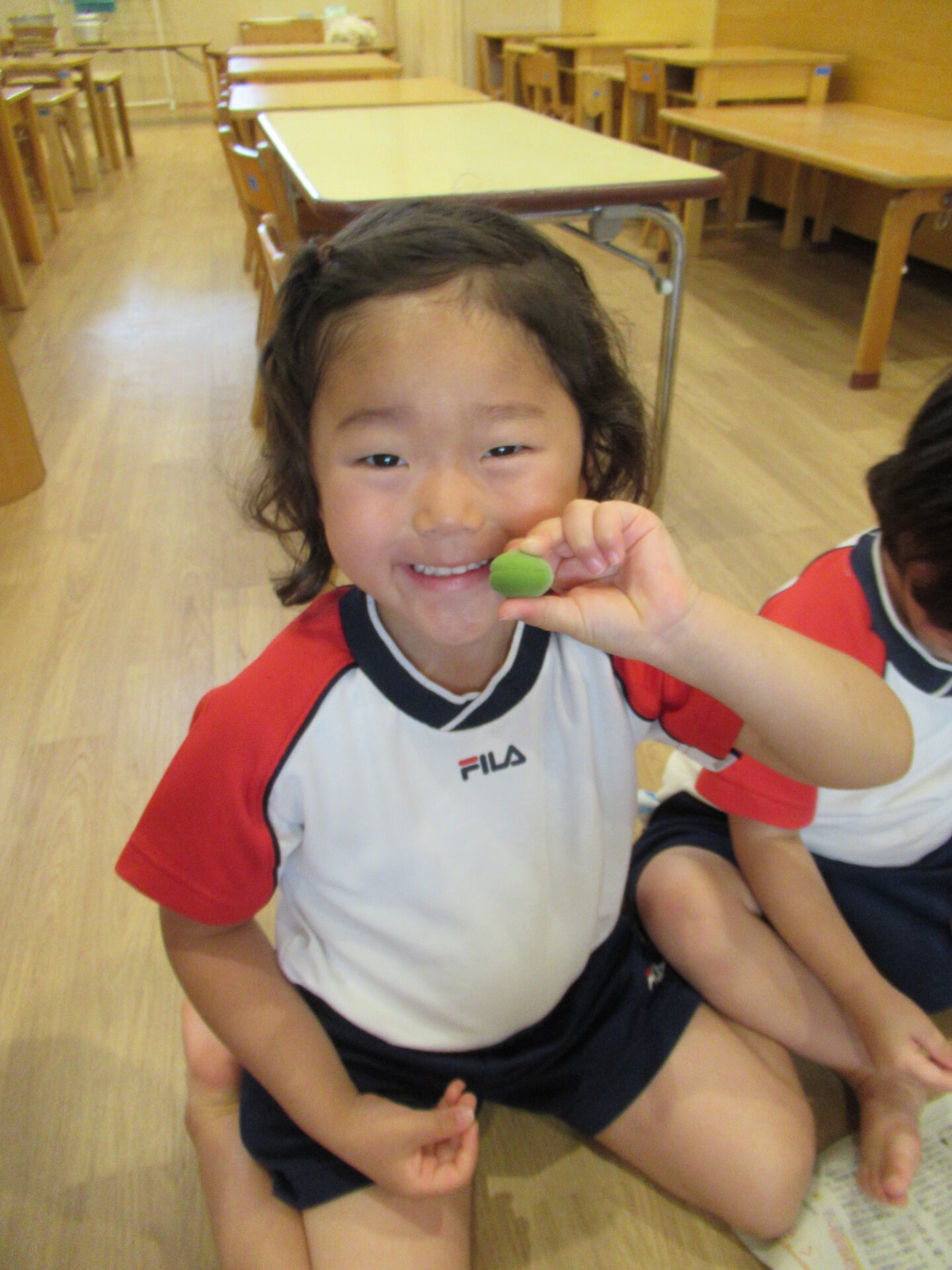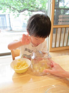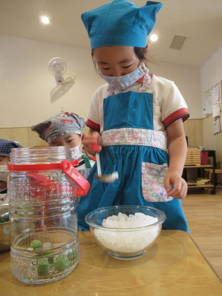 「氷砂糖溶けてきたよ」「梅がしわしわになっちゃった!」と給食室まで報告しに来てくれました♪