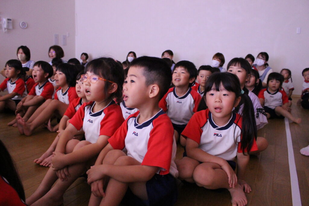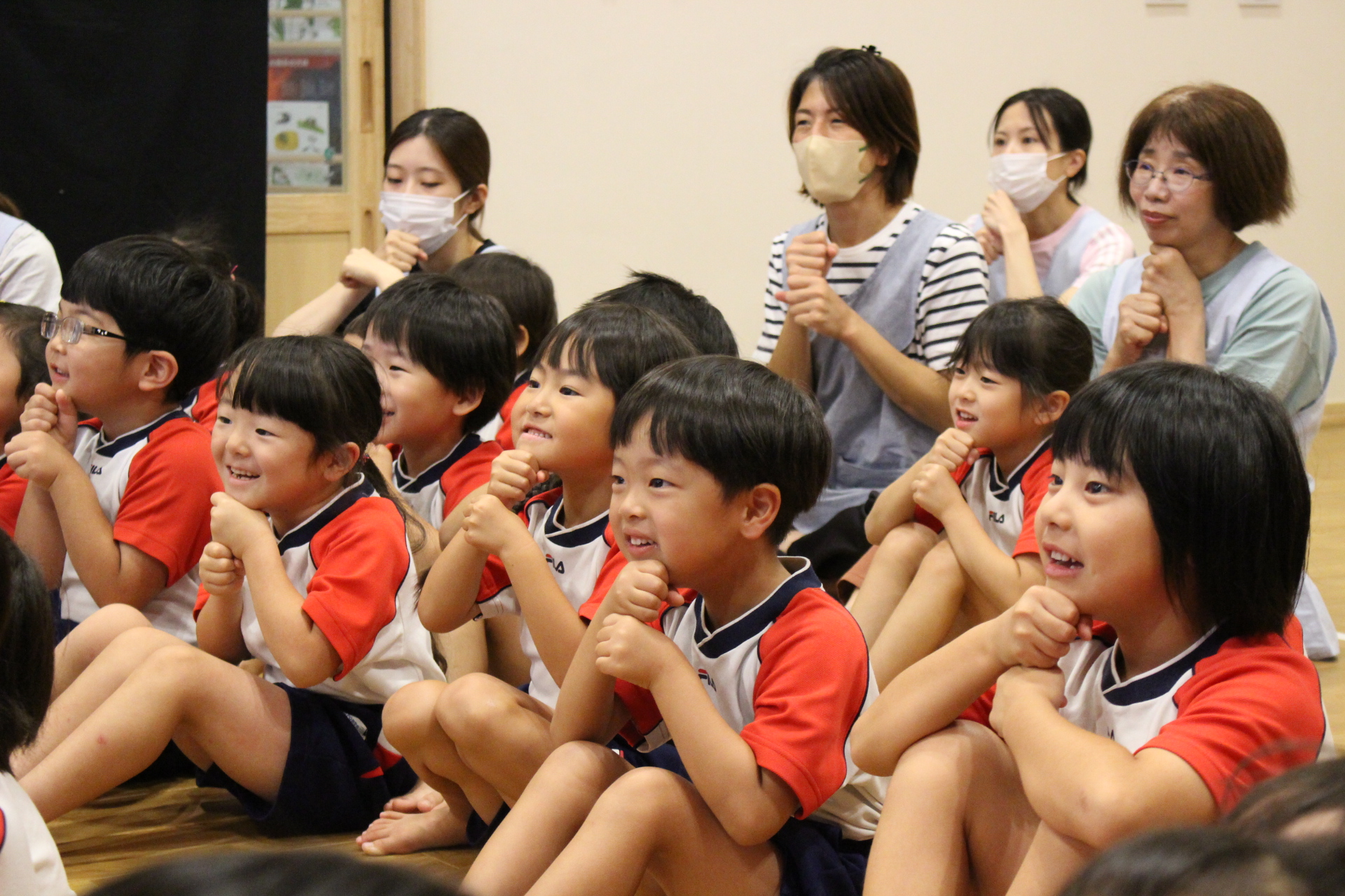 最初に司会の“ハタハタさん”と一緒に子ども達の大好きな「パンダウサギコアラ」「とんとんとんとんひげじいさん」の手遊びをハタハタバージョンでしました。コミカルな手遊びにみんな声を出して笑っていました。