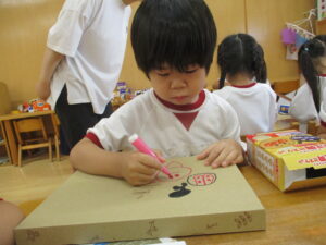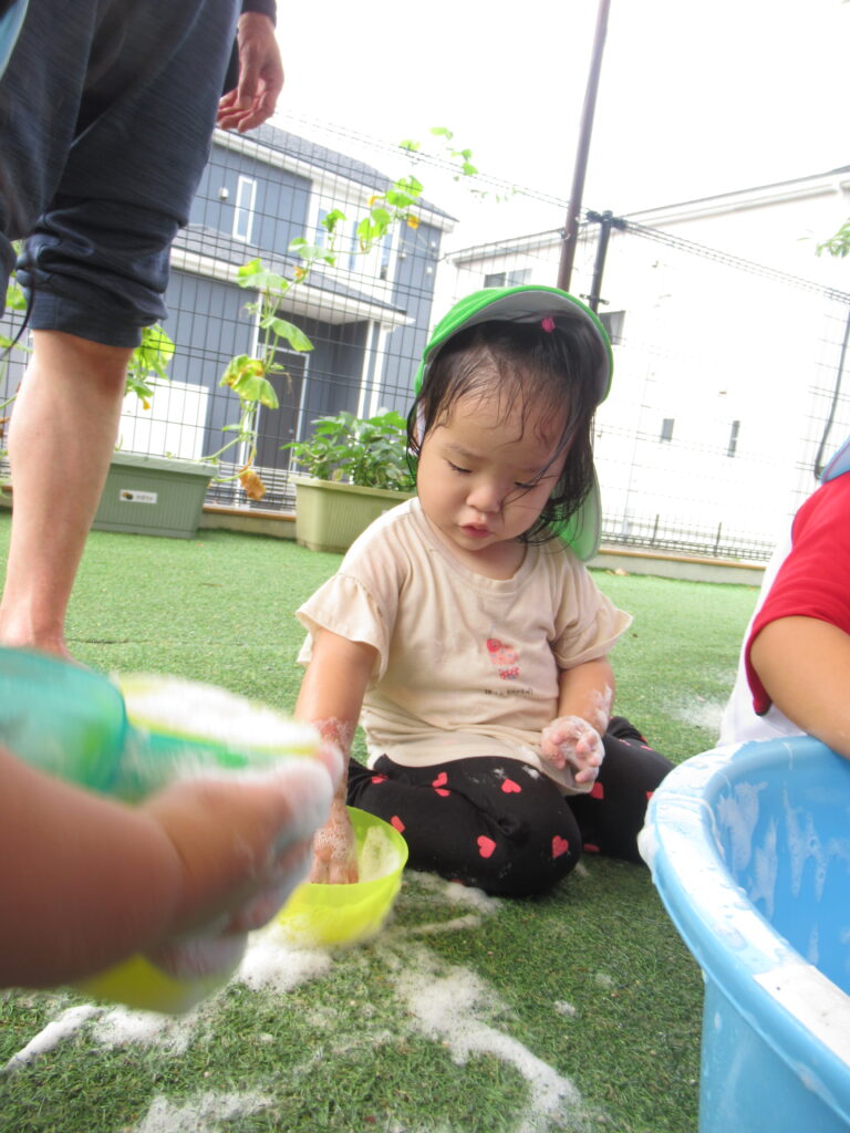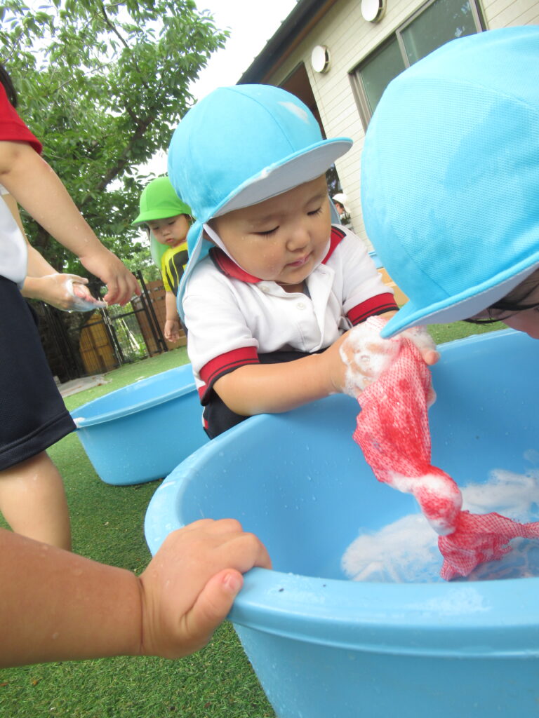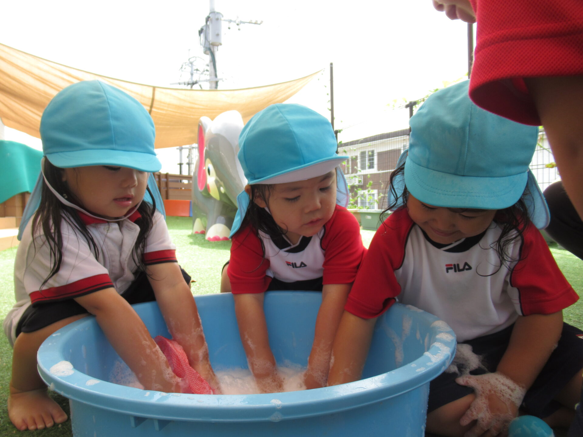 たらいの中で石鹸をこすって、じゃぶじゃぶと水をかき混ぜると、もこもこの泡がどんどん増えていきました。その様子に喜ぶ子供たち。