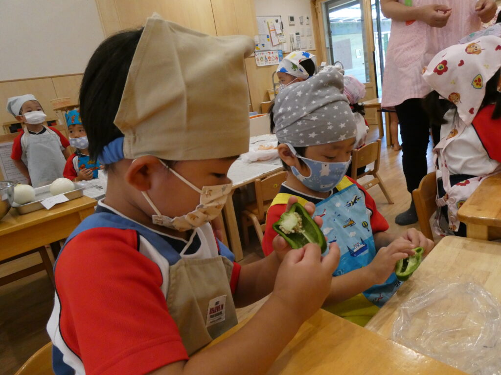 年少、年中さんが皮を剥いた野菜を、包丁を使って切っていきます。