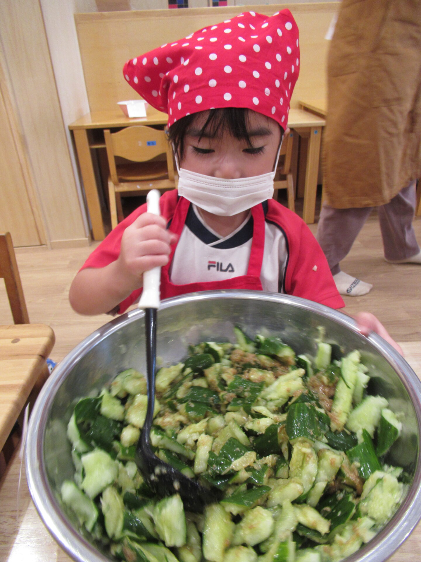 玉ねぎの皮むきをしたり、きゅうりをたたいて味付けをして「たたききゅうり」を作りました。